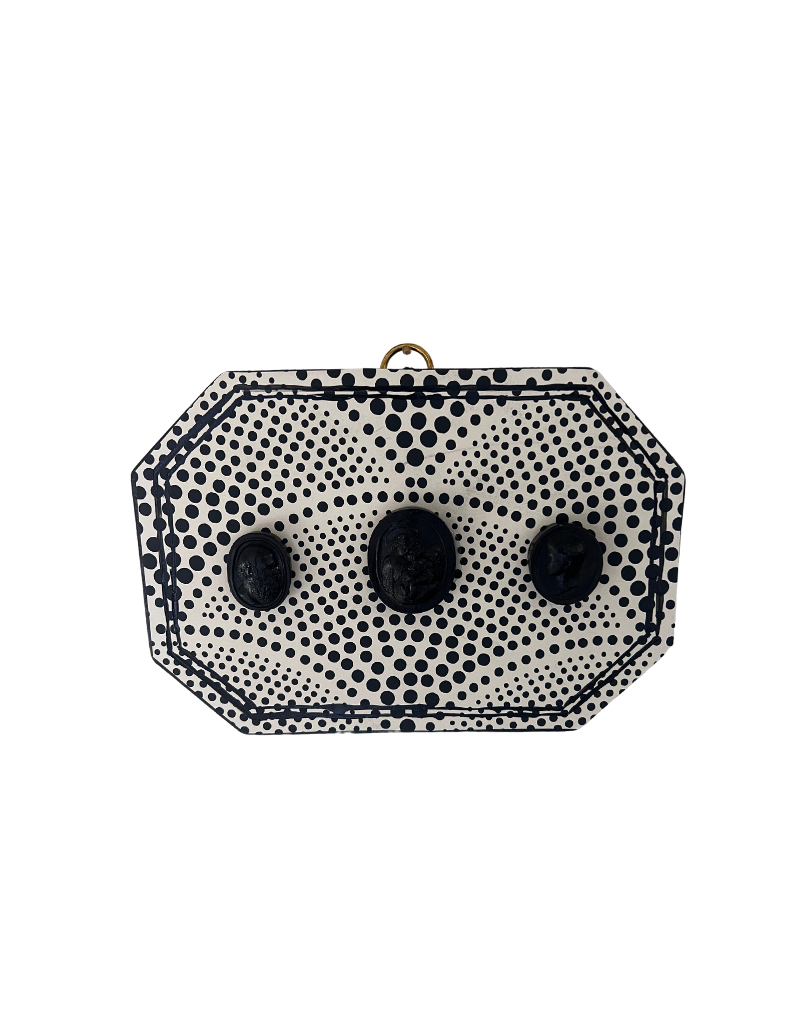 - Drie handgemaakte gipsen Intaglios, zwart geverfd met daarop twee manspersonen en in het midden Maria met kind.