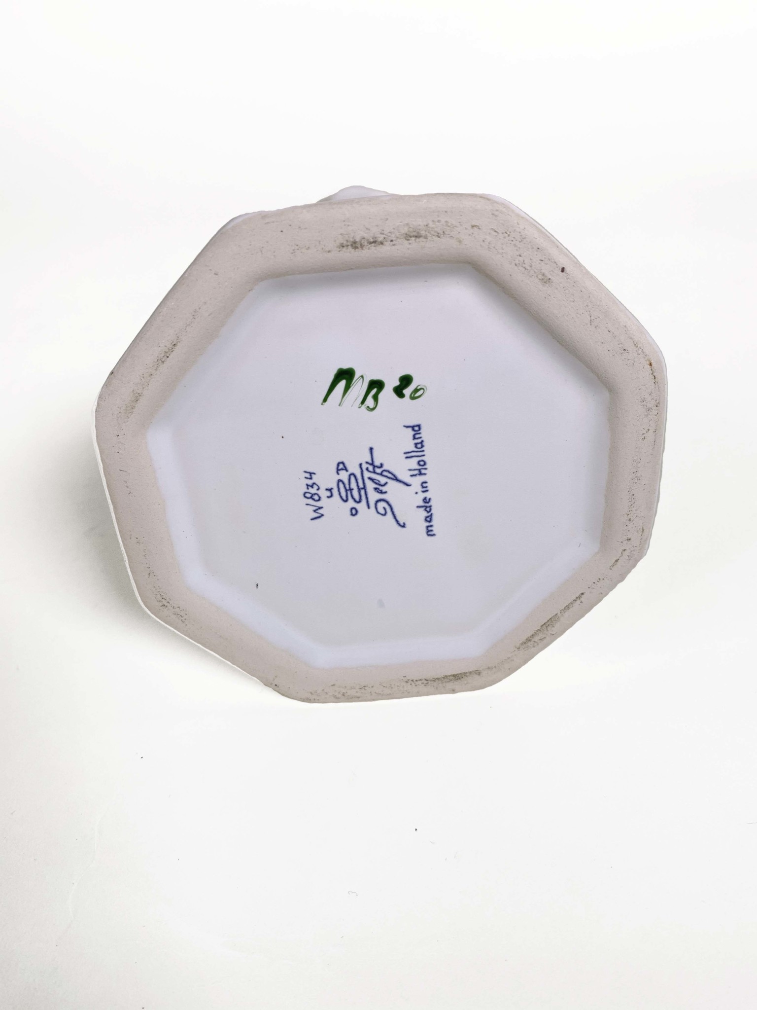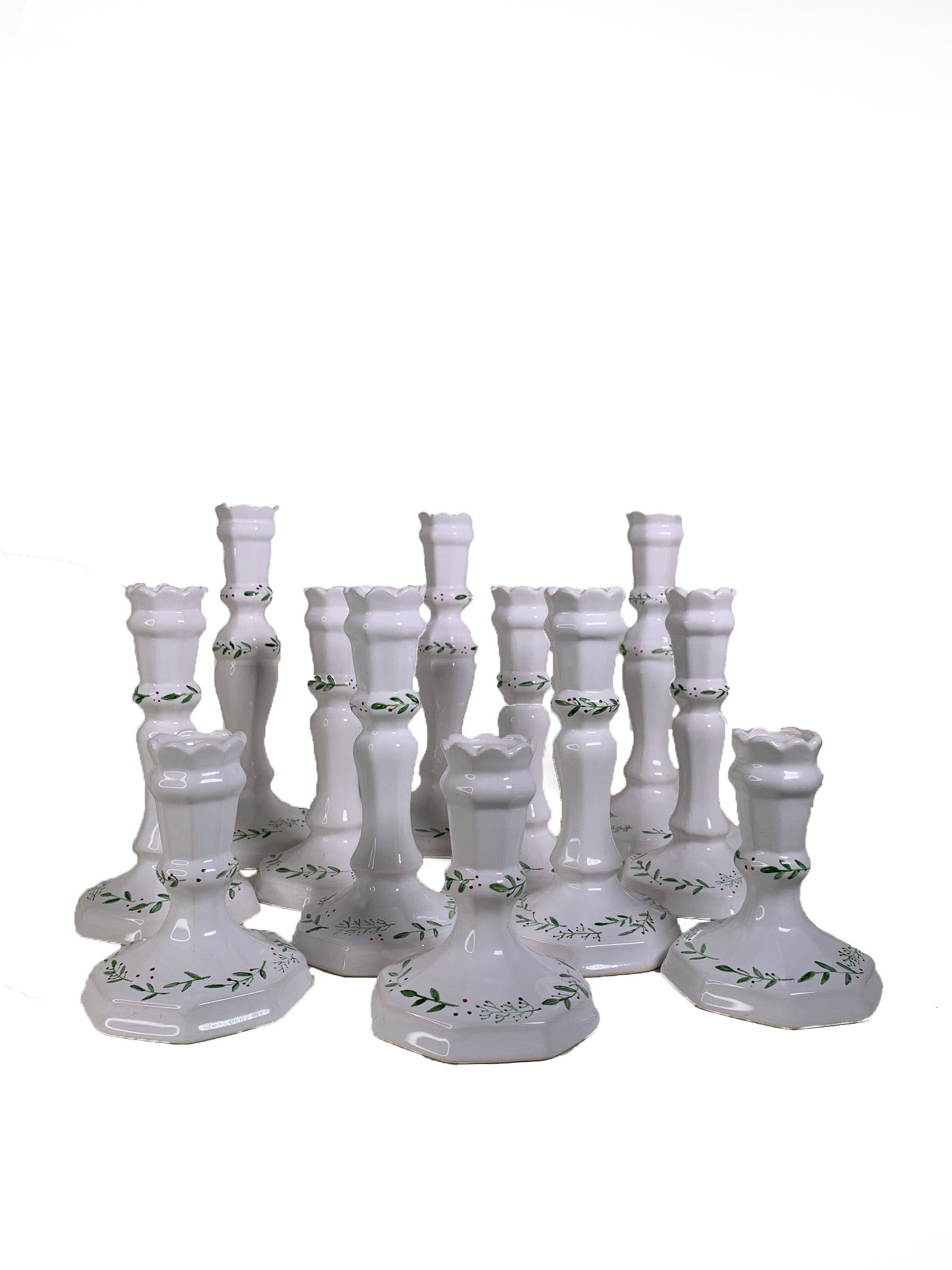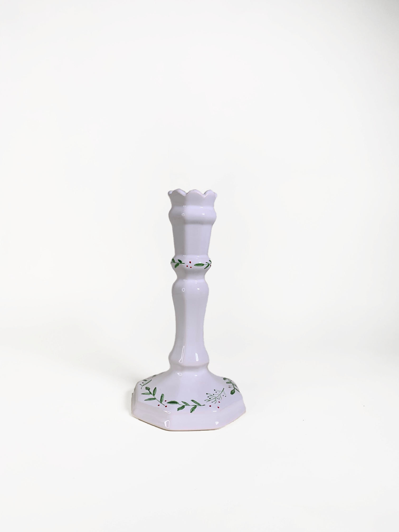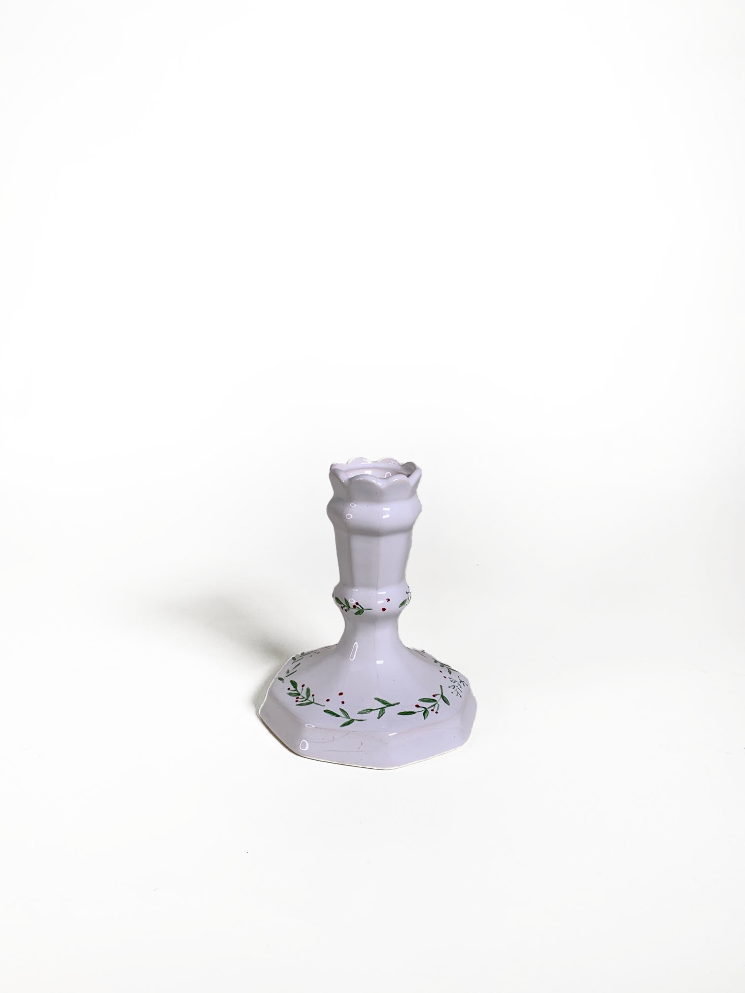 Vintage keramieken kandelaars van het Nederlandse aardewerkbedrijf 'Oud Delft'. Oorspronkelijk waren ze gewoon wit. Marlies Boomsma versierde ze met de hand door er bladeren en bessen op te schilderen. Een perfecte aanvulling op elke tafel aankleding.