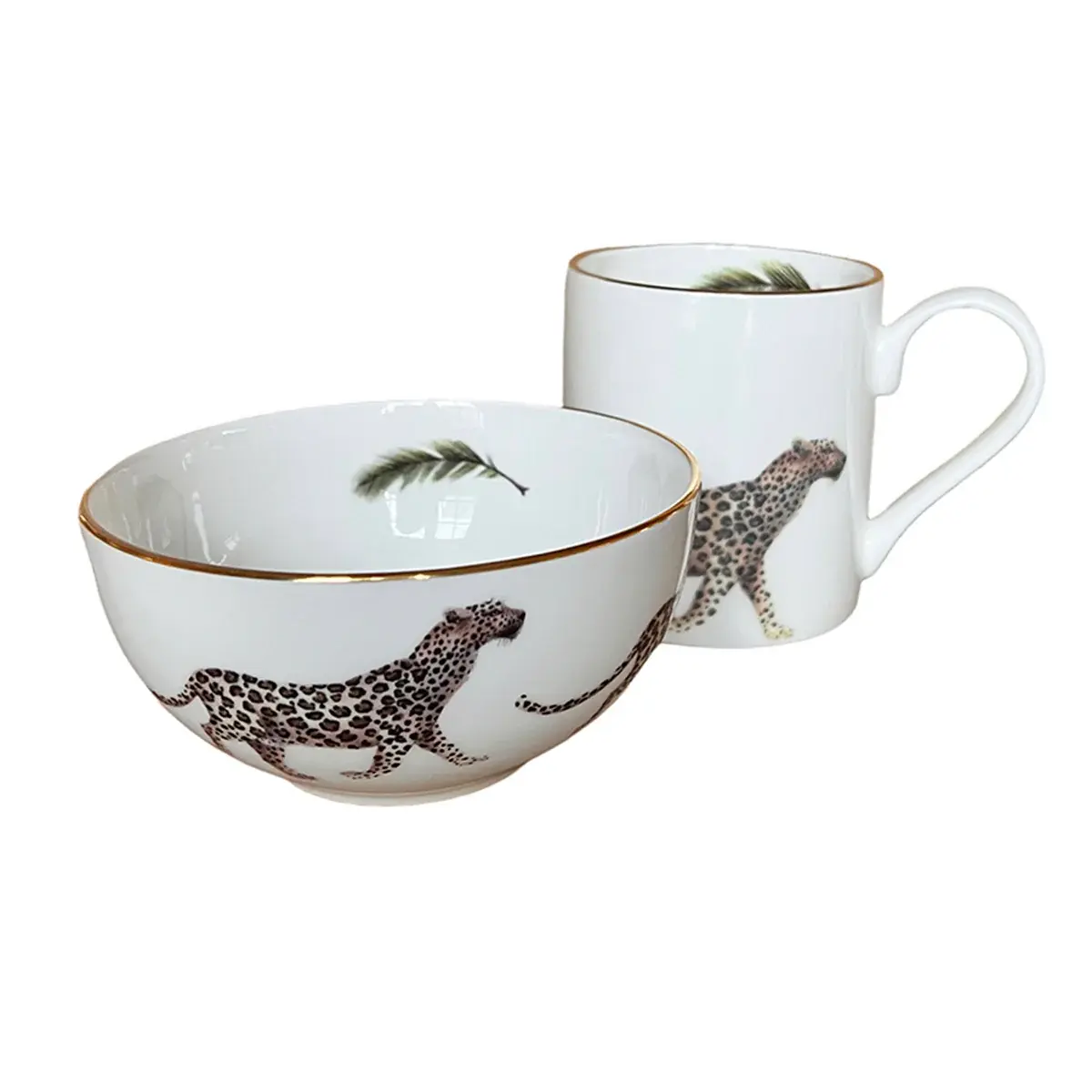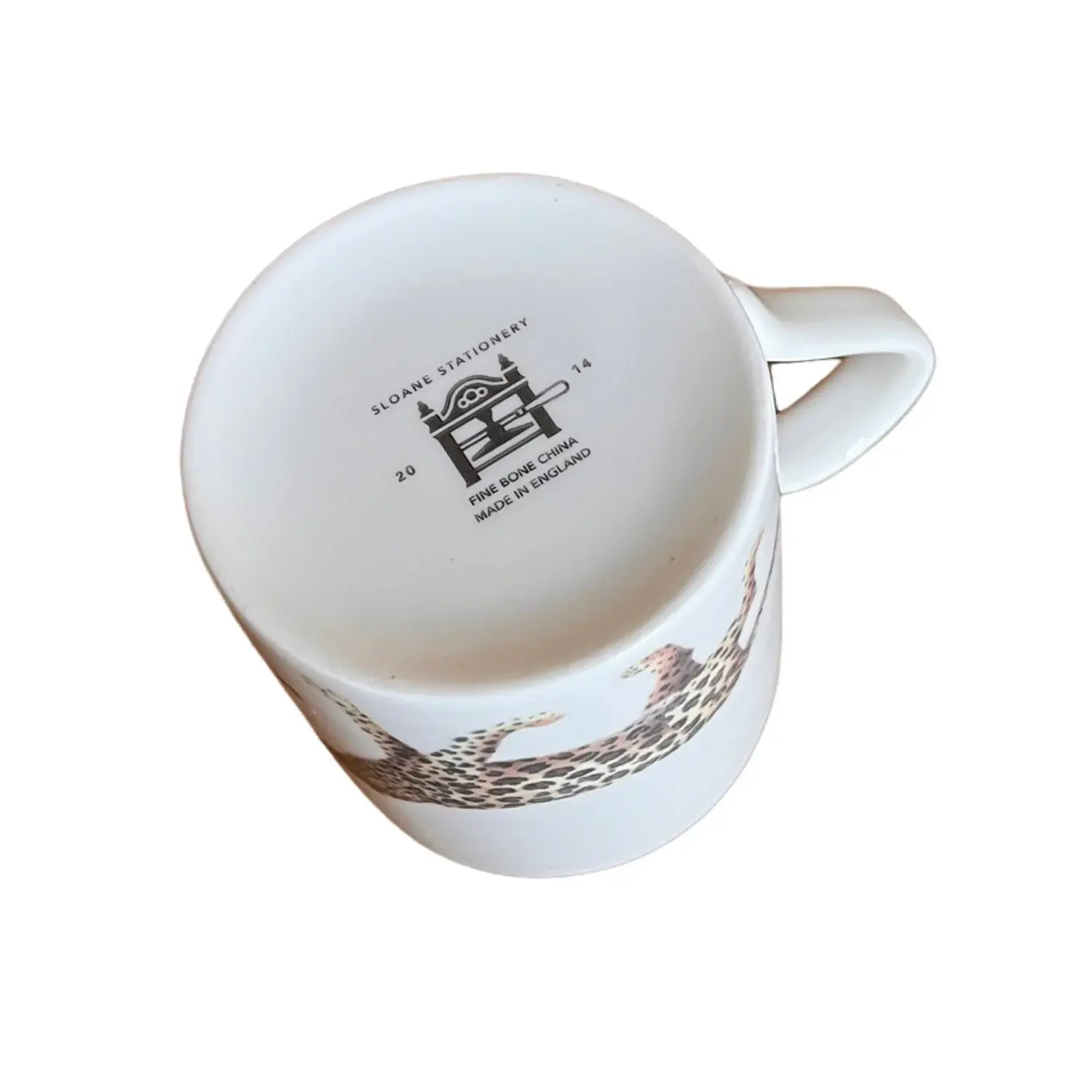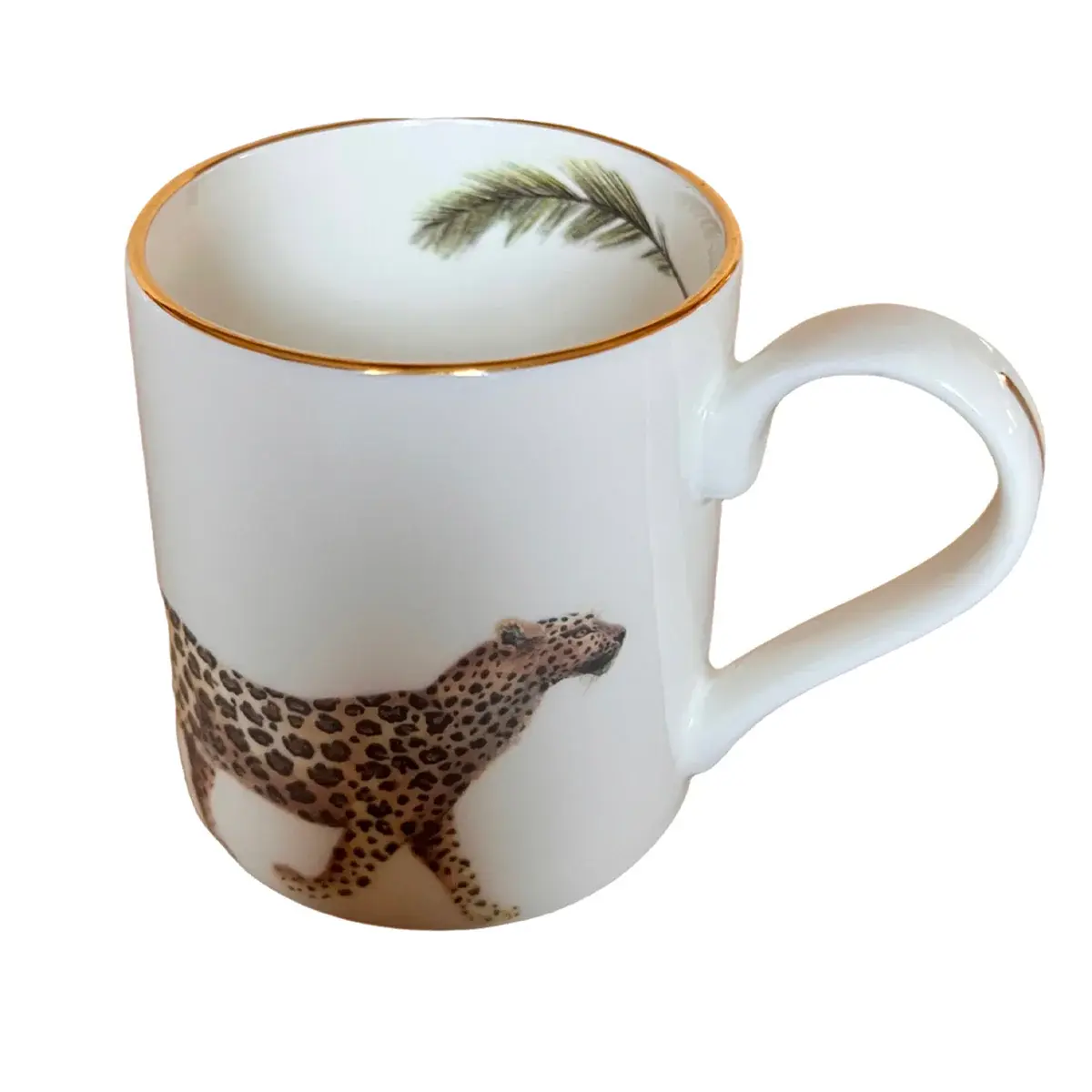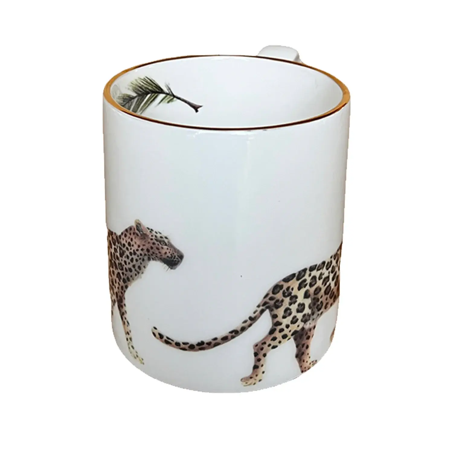 Gemaakt in Stoke on Trent, Engeland, is deze mok gedecoreerd met luipaarden en palm bladeren en afgemaakt met een gouden randje.