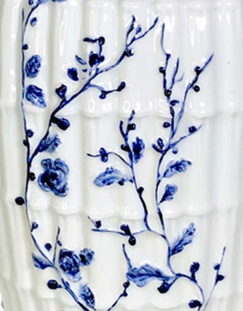 Geëmailleerde witte porseleinen Manises-lamp met decoraties van bamboe en bloemreliëf. Gemaakt in de traditie van de Spaanse Manises keramiek. Wat het echt een uniek exemplaar maakt is dat de lamp tevens met de hand beschilderd is door Marlies Boomsma.
