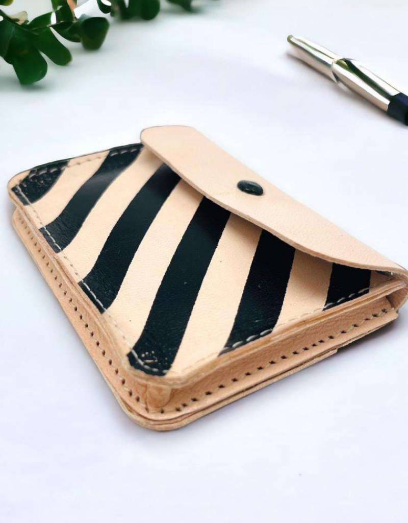 Dit kleine portemonneetje is een echte everyday essential: compact, praktisch en subtiel opvallend. Gemaakt van soepel leer en afgewerkt met een grafisch gestreept patroon aan de voorzijde, dat zorgt voor een moderne twist op een tijdloos ontwerp.