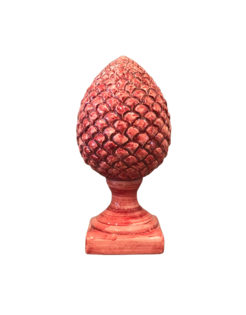 Frambooskleurige pijnappel op voet als pronkstuk in een kast of op een schouw. Op Sicilië  wordt een pijnappelornament nog steeds cadeau gegeven bij belangrijke gebeurtenissen, zoals een geboorte, huwelijk of nieuwe huis. Deze hedendaagse monochrome versie is gemaakt van klei, handbeschilderd en geglazuurd in Sicilië.
