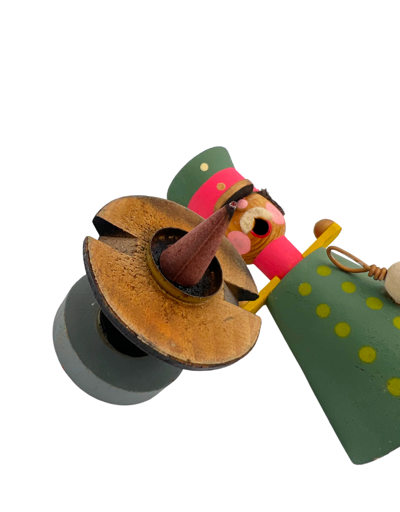 Til het bovenlichaam van het mannetje omhoog en op de voet een konisch stukje wierook leggen, aansteken en de bovenkant er weer op plaatsen.