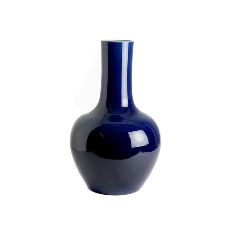 Deze porseleinen vaas heeft een diepe saffierblauwe kleur en een rechte hals. Geweldig op zichzelf, mooi met wat bloemen erin.