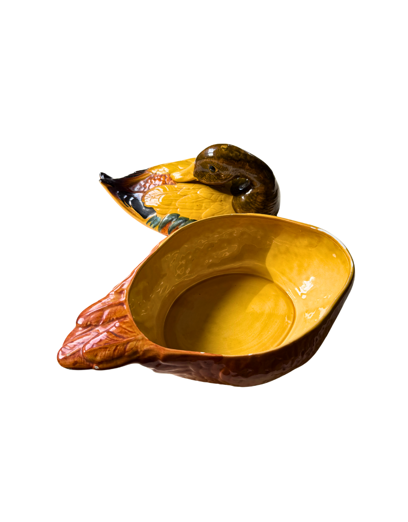 Deze prachtige keramische eendenterrine is afkomstig uit het hart van Toscane. Met de hand beschilderd in warme, rijke tinten en zowel decoratief als functioneel. Een schitterend statementstuk voor liefhebbers van vintage servies en curiosa.