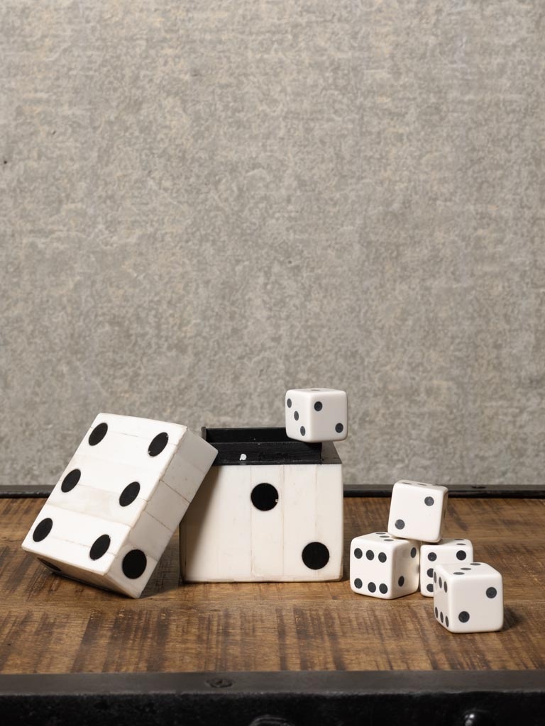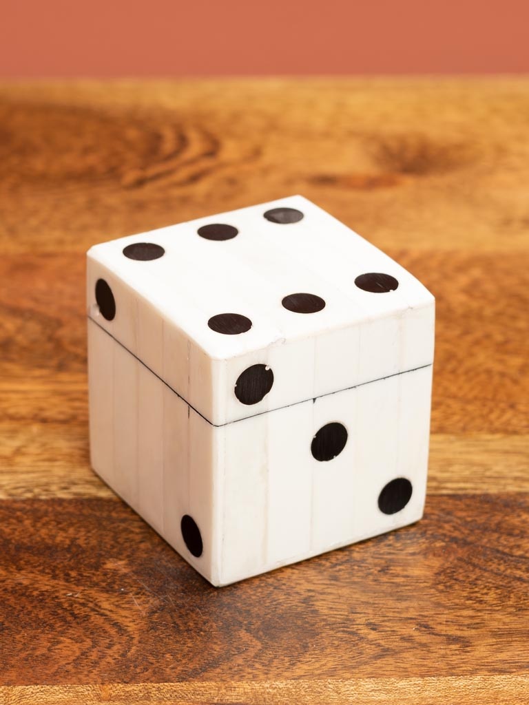 Geweldig klein doosje in de vorm van een grote dobbelsteen. Gemaakt van hout en been. Het wordt geleverd met vijf harsdobbelstenen van normaal formaat (wit met zwarte stippen). We hebben ook een grotere doos in de collectie. Deze heeft bottendobbelstenen aan de binnenkant.
