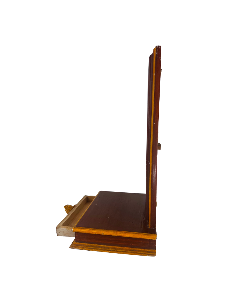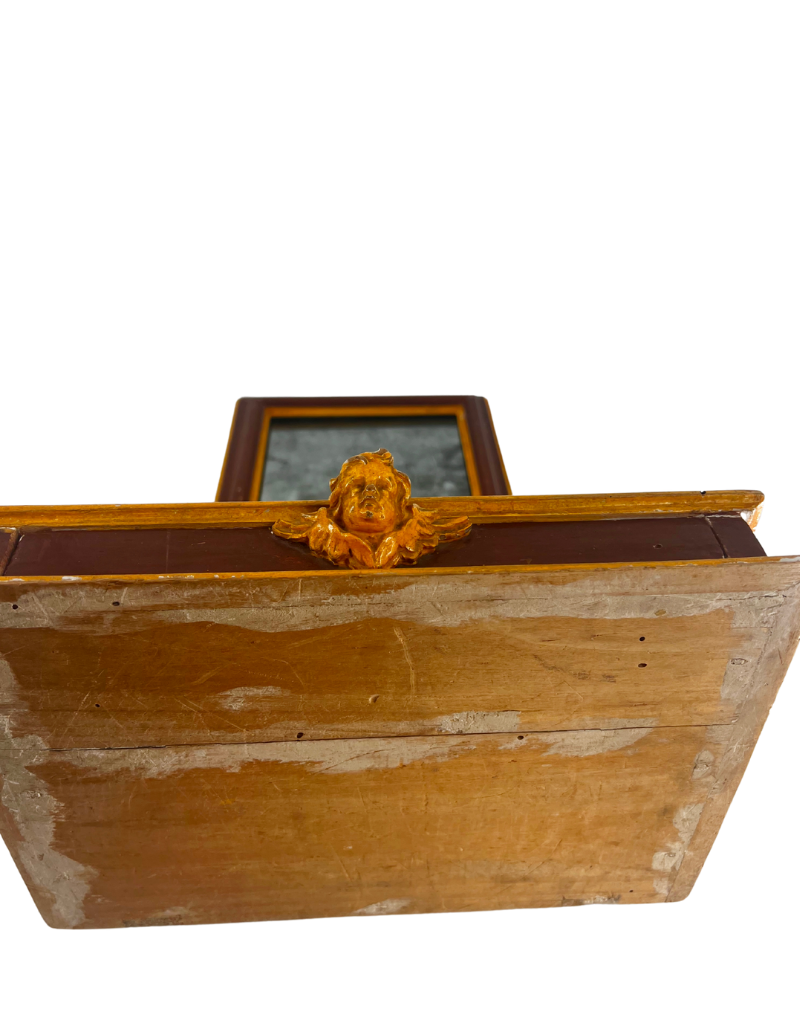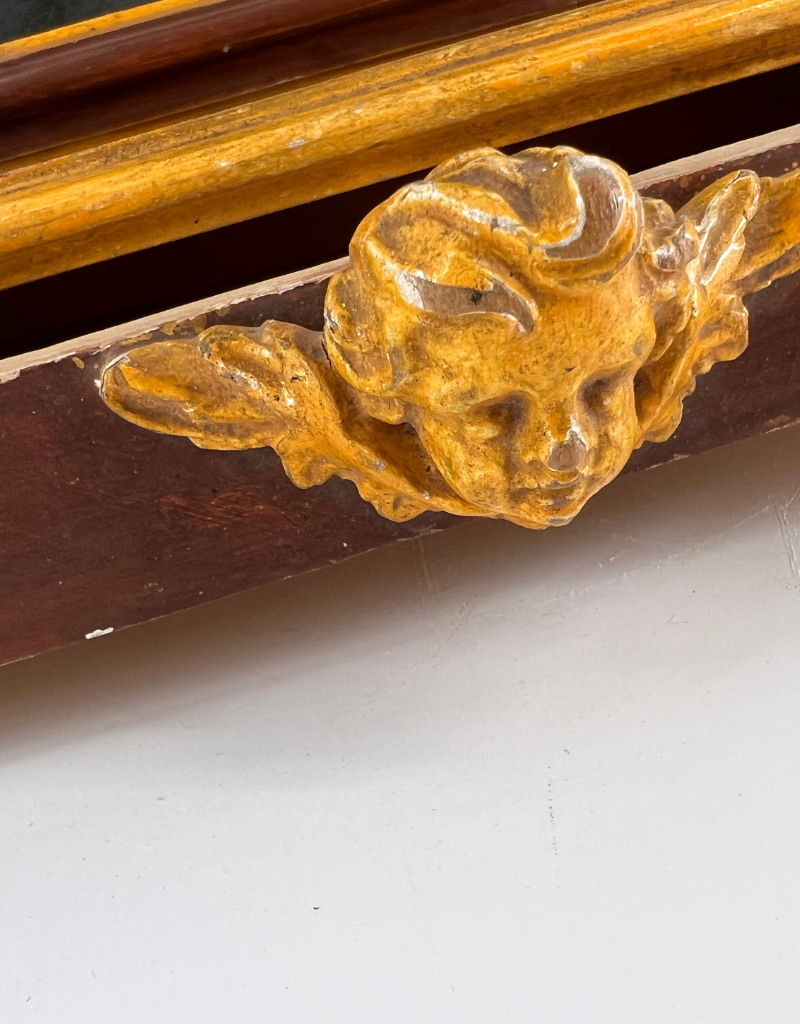 Create an accountThink what a super nice highlight corner you can make with this wooden mirror with drawer. The lady from whom I bought it said that it comes from the 18th century in Italy. The color of the wood, the antique mirror, the details of the frame and of course the angel with which you also open the drawer, all make this a great treasure!