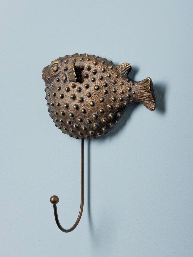Add a touch of quirky ocean charm to your home with this antique gold pufferfish wall hook. Made from durable resin with an iron hook, this detailed design combines functionality with decorative appeal. Whether used in a hallway, bathroom, or kitchen, it brings a playful yet elegant accent to your wall.