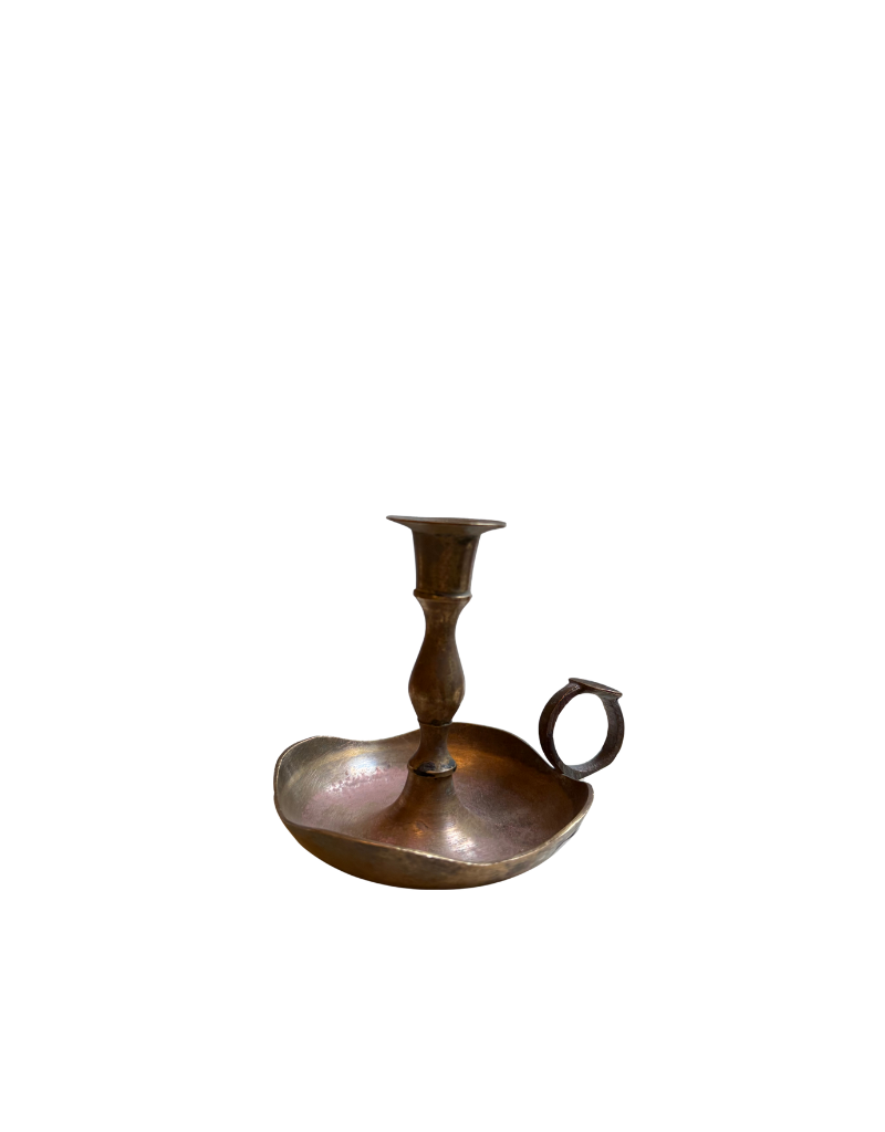 Bring a touch of old-world warmth to your home with this beautifully aged vintage brass candle holder. Sourced in Spain, this piece features a rounded dish base and an elegant curved stem, ending in a traditional finger-loop handle that gives it both personality and practicality.