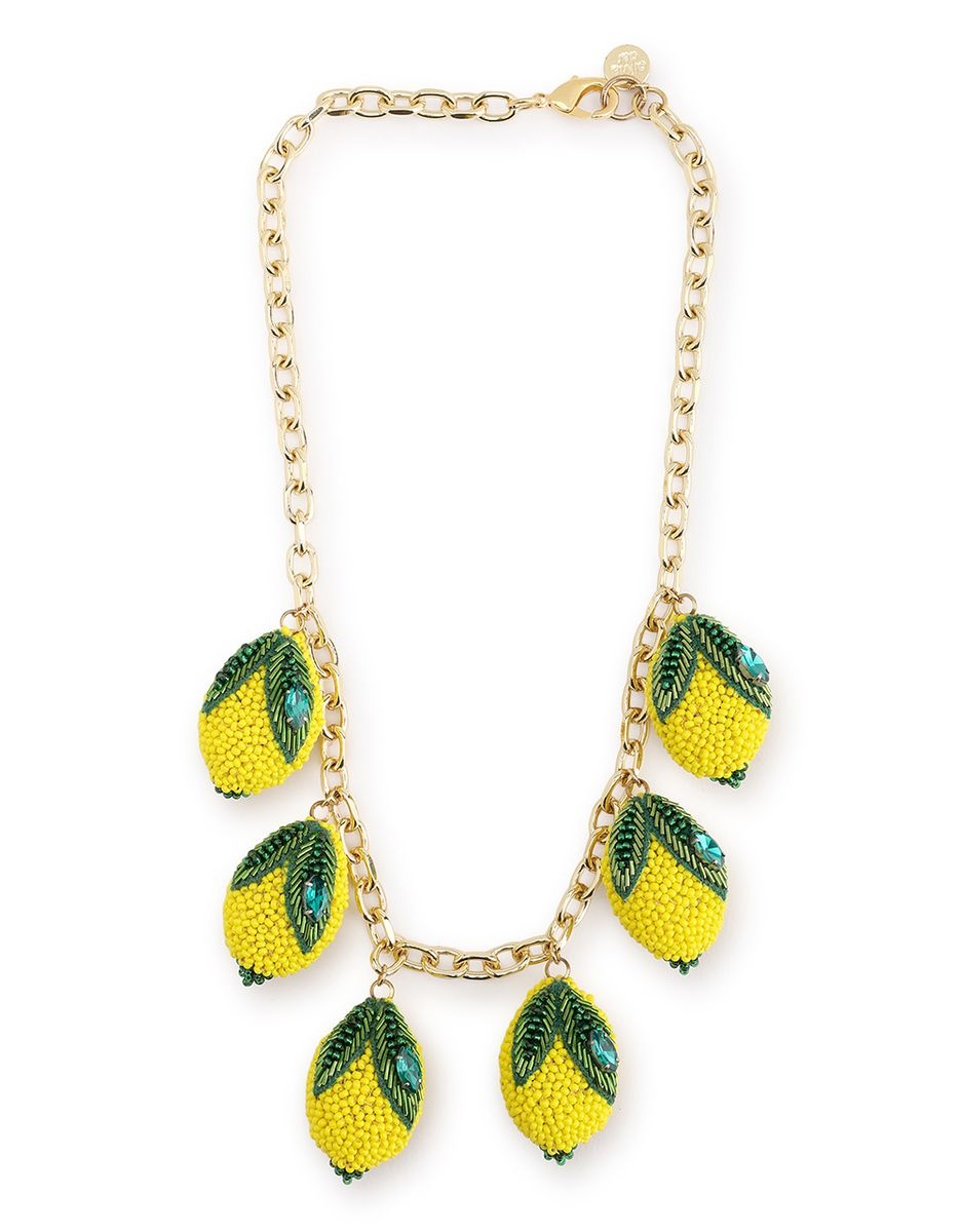 This Citrus Necklace by Olivia Dar features a playful arrangement of hand-embroidered lemons, suspended from a gold-tone chain. Each lemon is carefully crafted with vibrant yellow beadwork and finished with deep green leaf details, creating texture, colour and subtle sparkle.