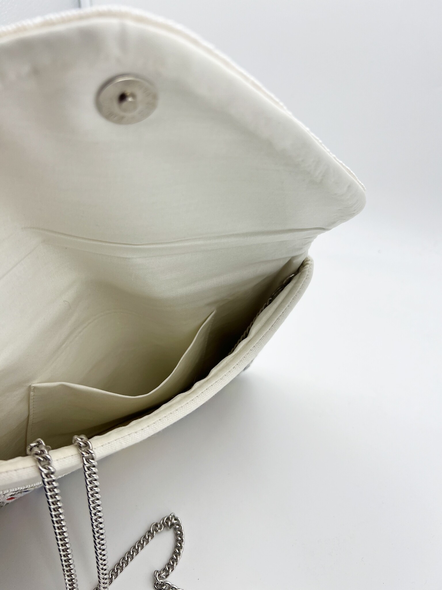Create an accountAbout this silver beaded clutch bag with flowers