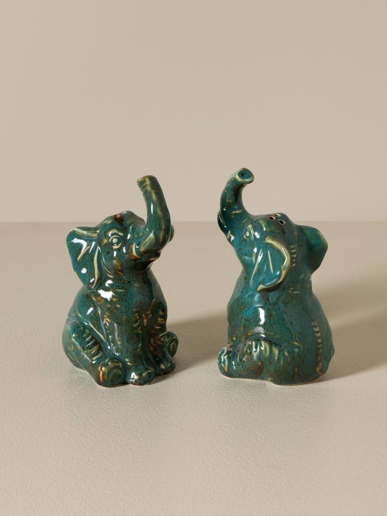 This delightful salt and pepper set features two small elephants with their trunks raised — a symbol traditionally associated with good luck and happiness. Finished in a rich green glaze with subtle golden accents, the pair brings a playful yet elegant touch to any table setting.