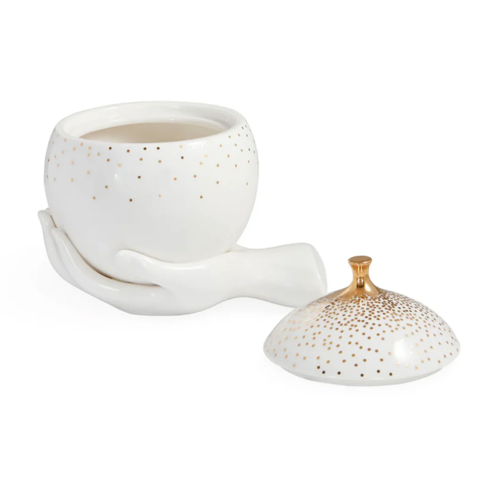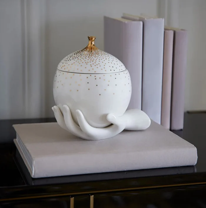 Crafted with a bold combination of white porcelain and gleaming gold accents, the Gilded Eve Box captures the essence of modern luxury. Its sculptural details, inspired by classical motifs, make it an eye-catching addition to coffee tables, vanity setups, or bookshelves. The hand-painted gold glaze not only enhances its aesthetic appeal but also makes it a conversation starter for any room.