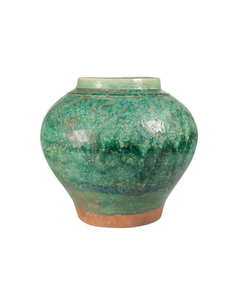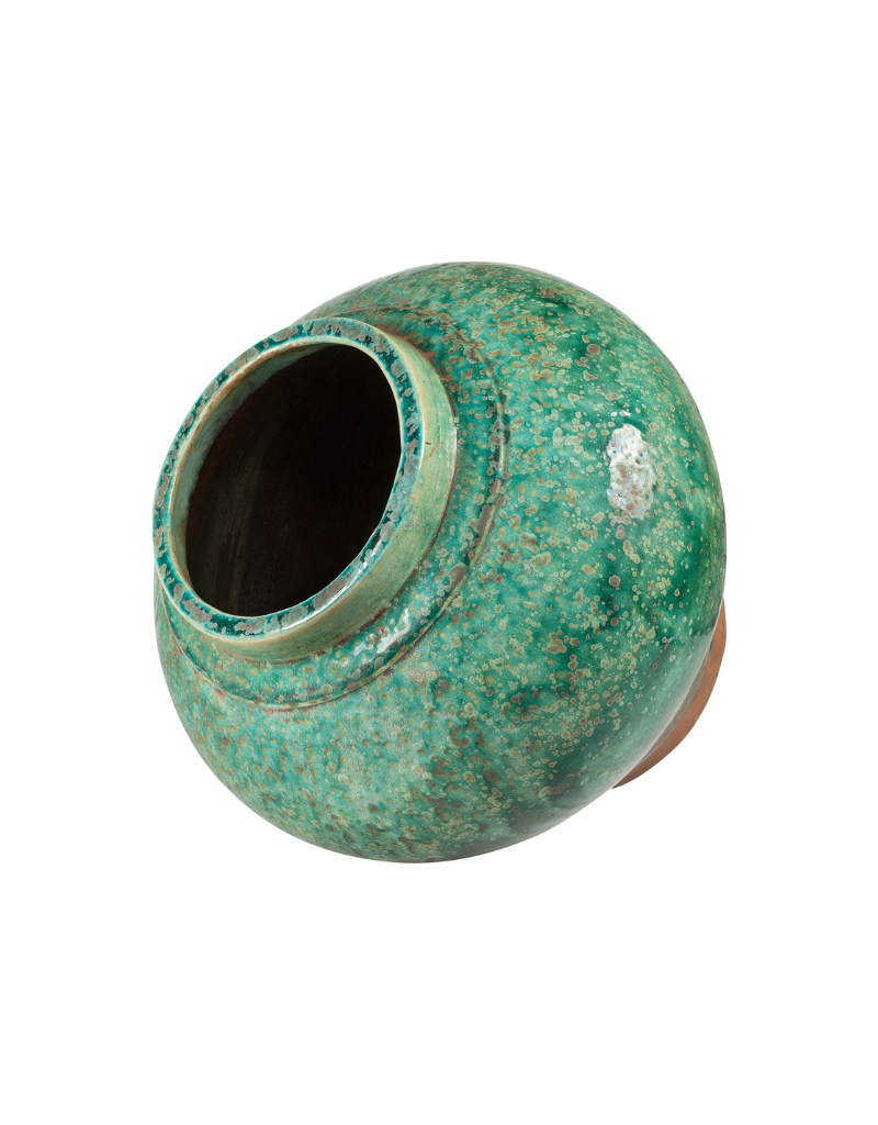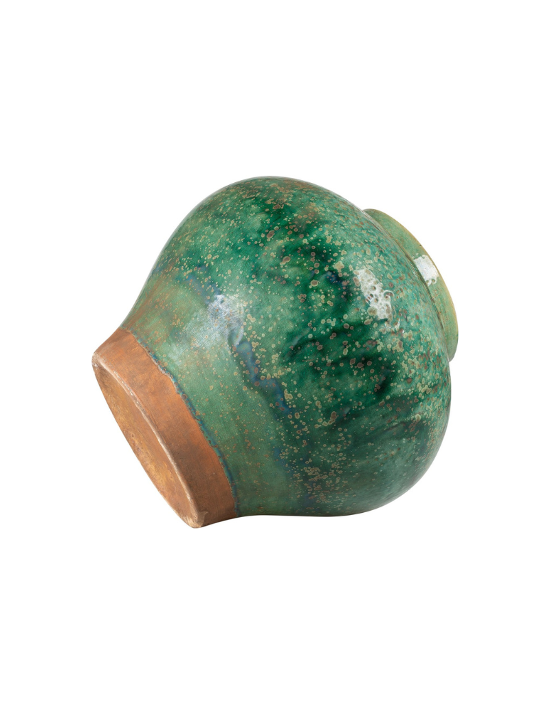 Handmade, rustic vase with beautiful glaze in shades of green on a terracotta surface. Beautiful convex shape, beautiful on a large round table, for example.