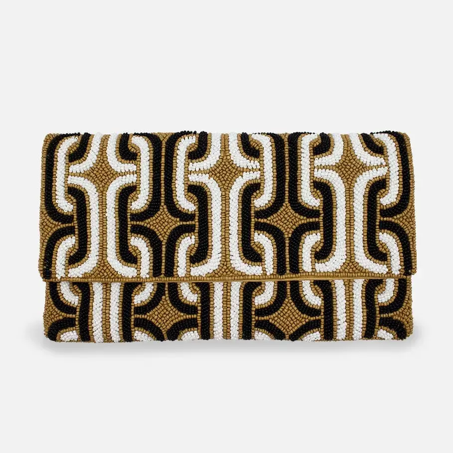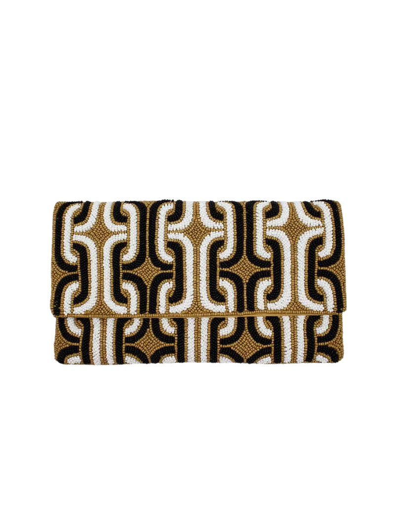 The Mocha Beaded Clutch is an elegant statement accessory, defined by its intricate geometric pattern in warm mocha, black, and soft ivory tones. Designed in the USA and handmade in India, this clutch is completely hand-embroidered with glass beads, showcasing exceptional craftsmanship and attention to detail.