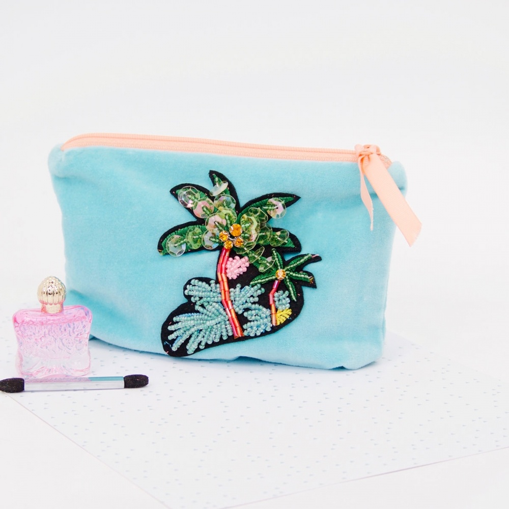 Sweet cotton velvet pouch with a palm tree sequins application for make up, jewelry or pencils.