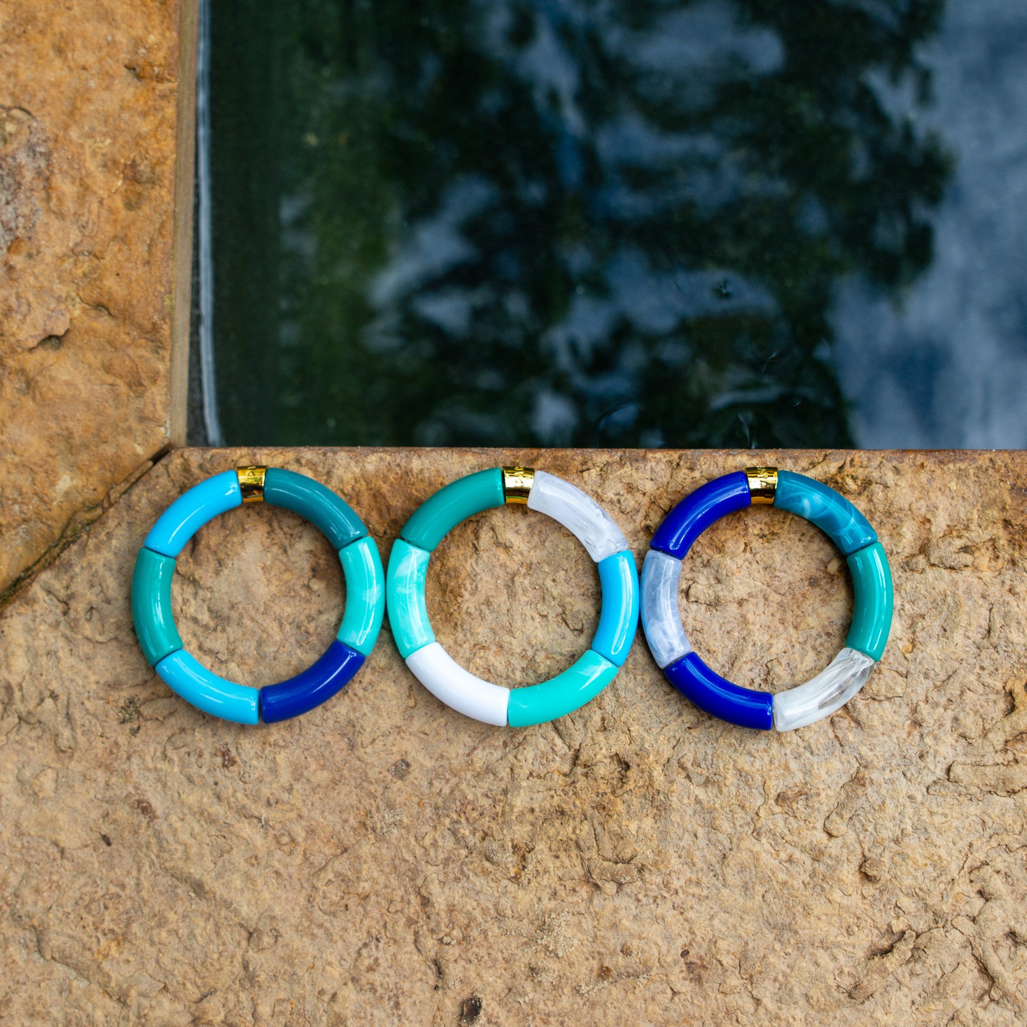 Inspired by the ever-changing shades of the ocean, the Oceano bracelets by Parabaya combine vibrant blues, soft turquoise tones and subtle marbled accents into a refined yet playful design.