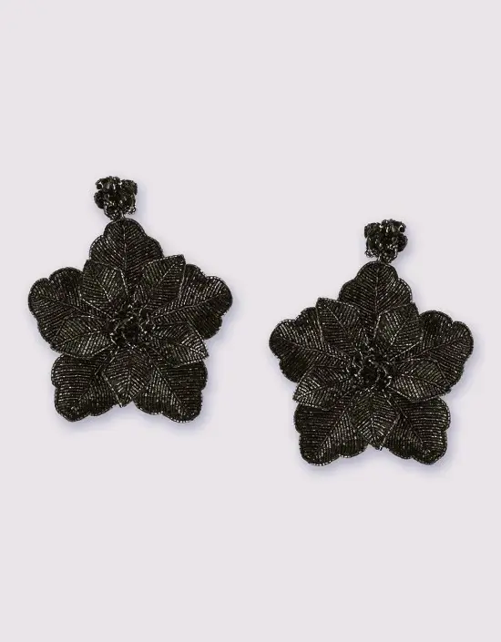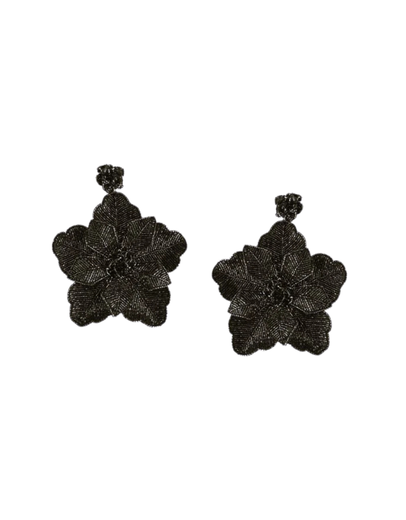 These Primrose Earrings by Olivia Dar are entirely hand-embroidered in layered black beadwork, creating a sculptural flower silhouette with rich texture and subtle shine. The intricate detailing gives depth and dimension, allowing the tonal black beads to catch the light beautifully.