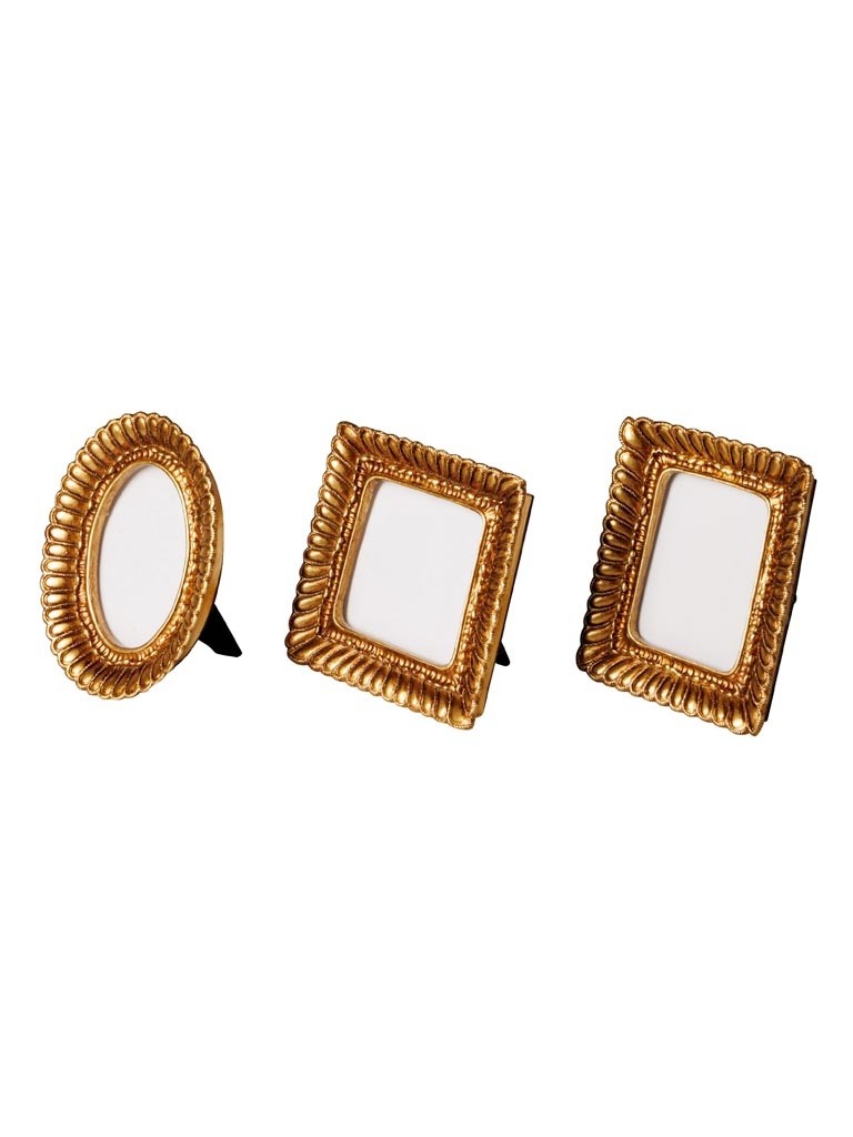 Set of three small golden photo frames with decorative fluted edges in oval, square and rectangular shapes.