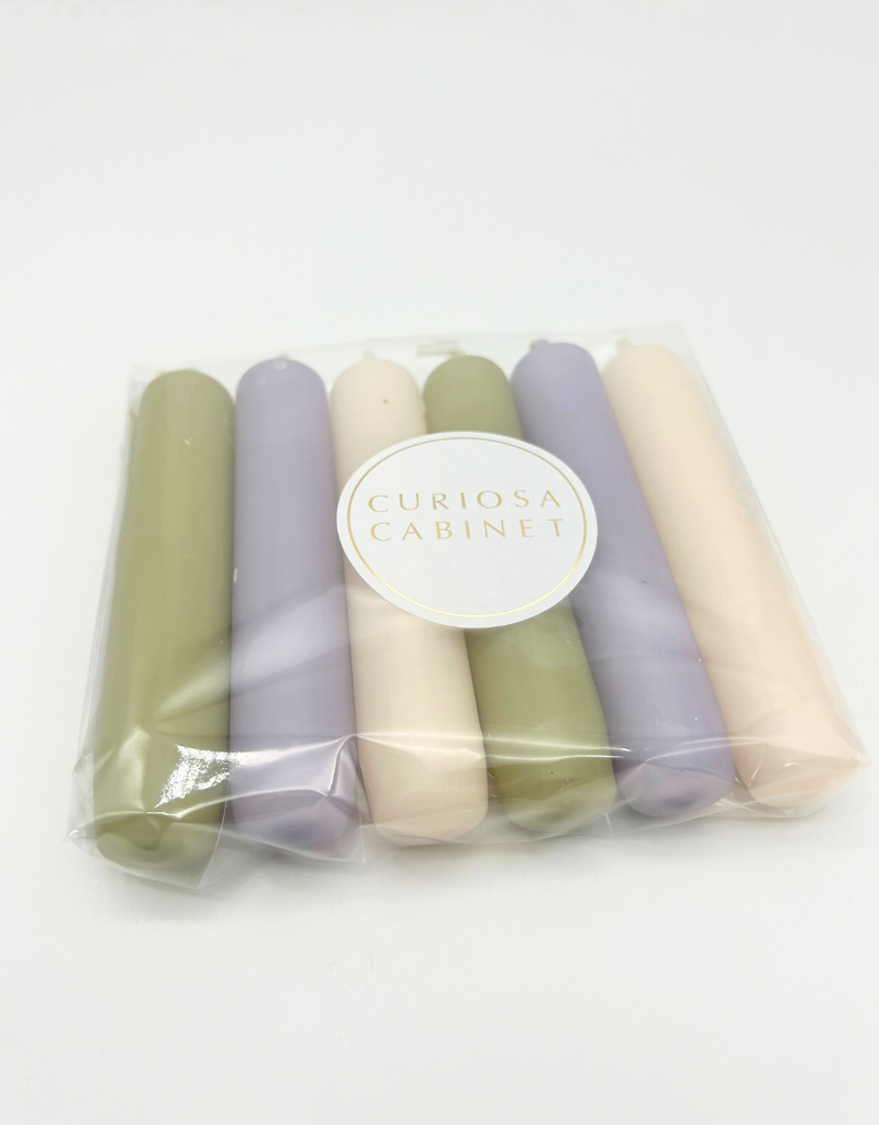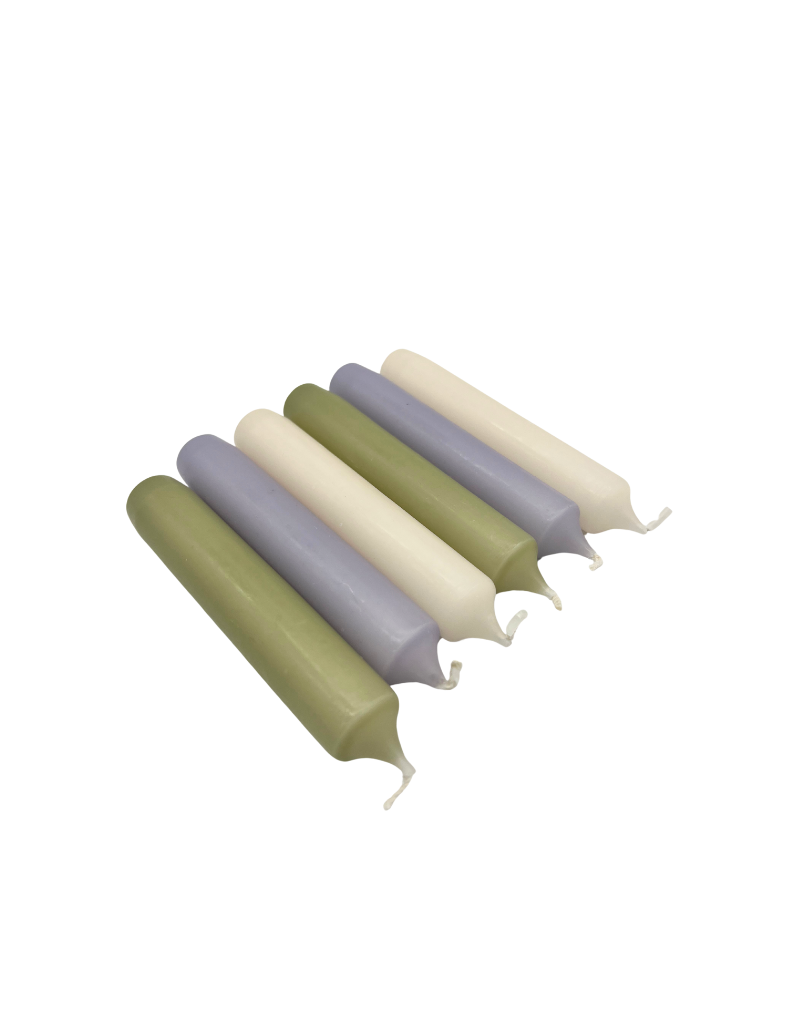 - Set of six candles, 2 creme, 2 lilac and 2 green