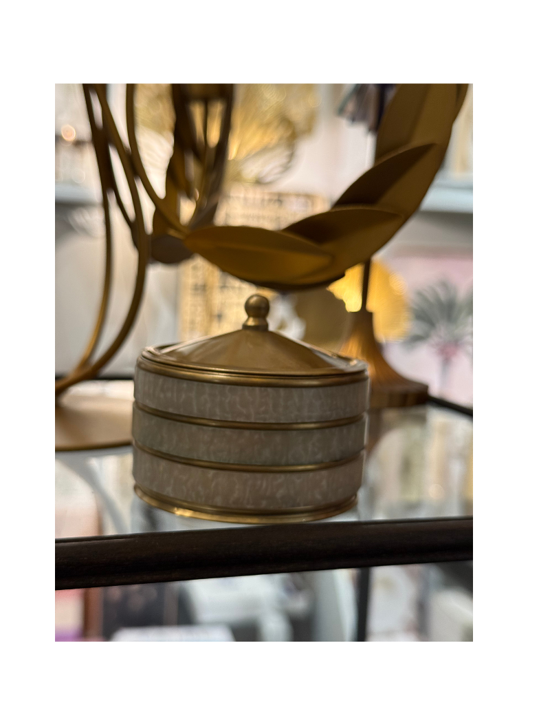 This round brass box is finished with a soft white inlay and topped with a charming brass knob. A refined decorative piece and a practical storage box for jewelry, keepsakes, or small everyday items.
