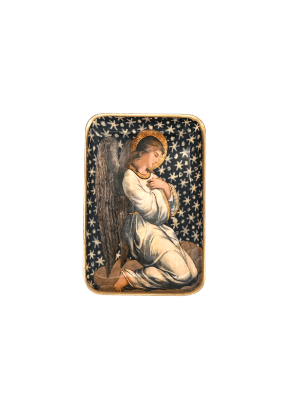 Celestial enamelled tray by Boncoeurs featuring a kneeling angel against a starry sky, finished with a hand-gilded border. A beautiful catchall for jewellery, keys or candles. Size 15.3 × 10 × 1.6 cm.