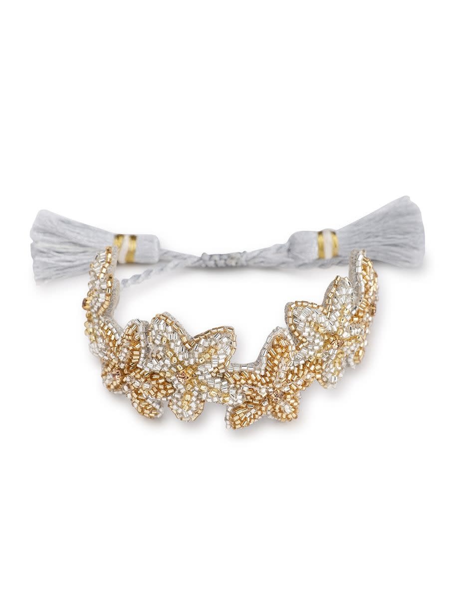 Hand-embroidered starfish bracelet by Olivia Dar in shimmering gold and ivory tones. A refined ocean-inspired accessory with adjustable tassel closure.