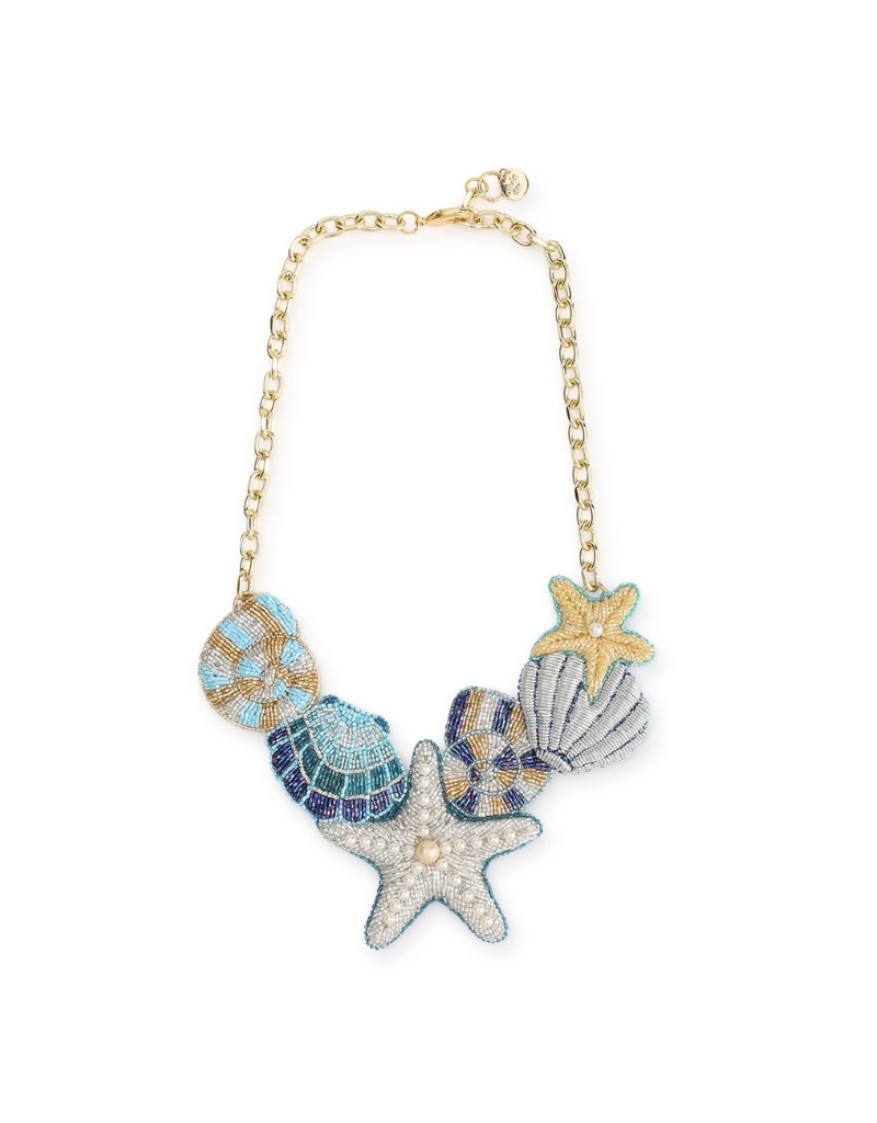 The sculptural design sits elegantly along the neckline, combining playful seaside inspiration with refined craftsmanship. The soft ocean palette makes it easy to style with both summer dresses and evening looks.