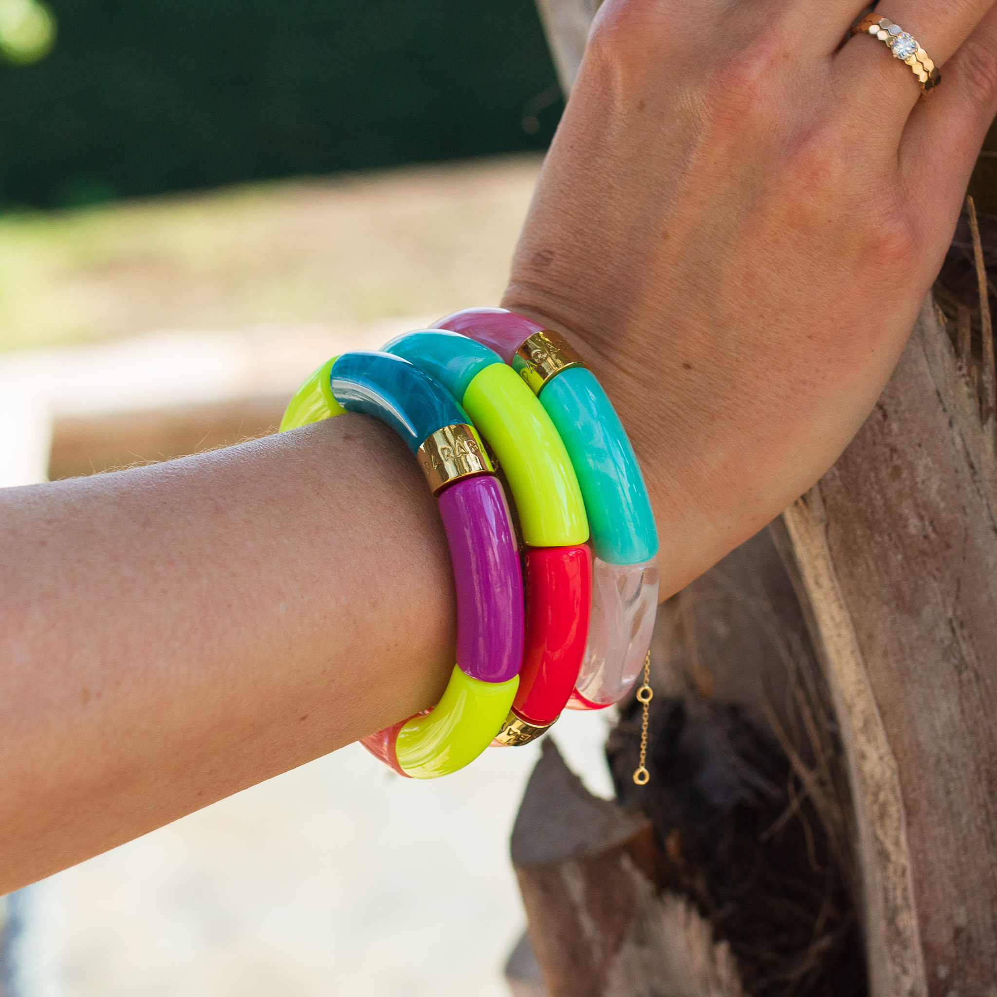 Bold, playful and full of energy—the Neon bracelets by Parabaya are designed to stand out. Vibrant shades of neon pink, lime, coral and turquoise are combined with soft marbled tones, creating a striking yet balanced composition.