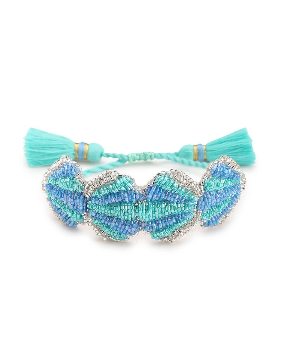 Hand-embroidered Venus bracelet by Olivia Dar in fresh mint and turquoise tones. A playful ocean-inspired accessory with adjustable tassel closure.