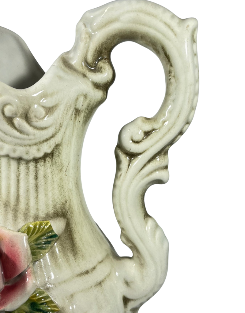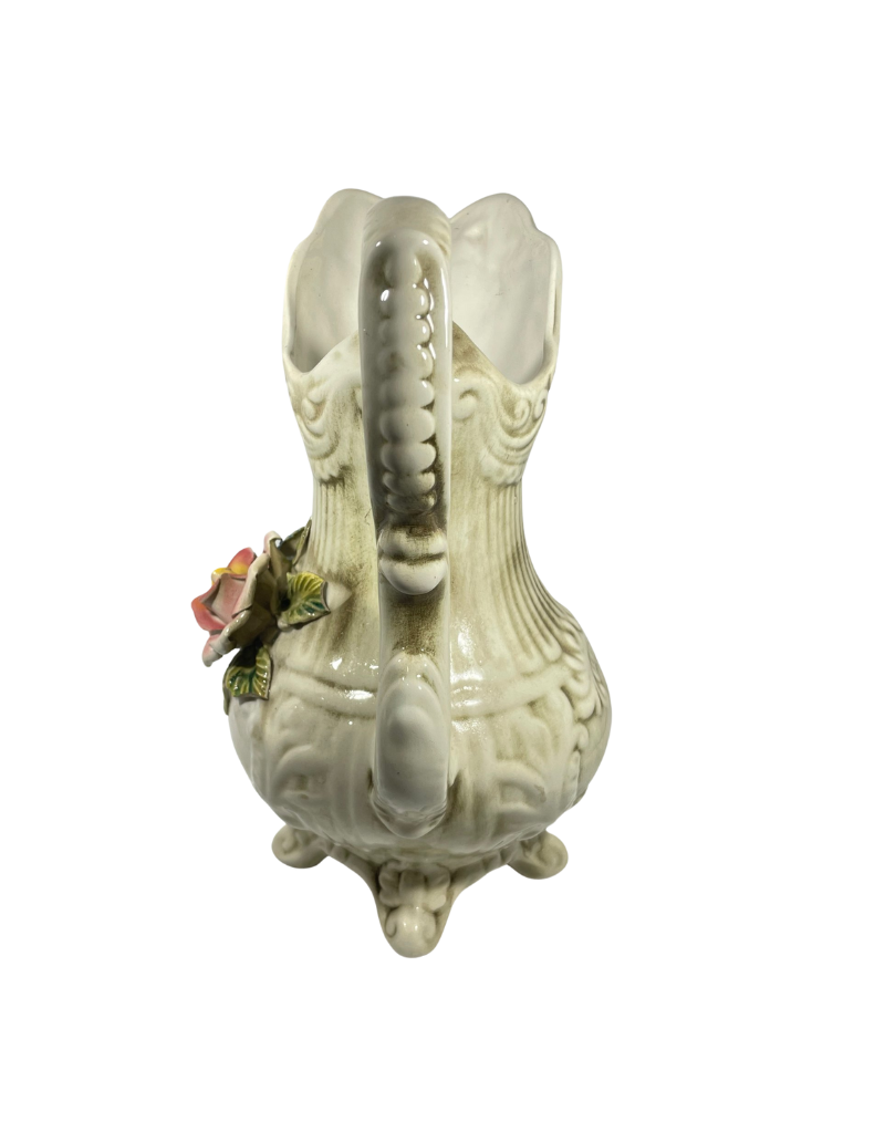 Beautiful romantic jug with pink ceramic flower. Made by the master craftsmen of Capodimonte, Italy.